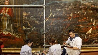 El Museo Naval muestra en directo la restauración de un cuadro de la célebre batalla El lienzo, pintado en la segunda mitad del XVII, tiene unas dimensiones de 300 x 536