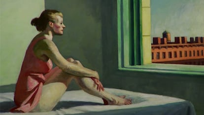 Pero la primera y conmocionante vez que observé en un catálogo, en una reproducción o en un libro, las pinturas de Edward Hopper sentí que ya conocía ese universo, esa luz, esa atmósfera, esos paisajes, ese misterio, ese estado de ánimo. Me lo había mostrado el cine en muchas ocasiones. Pretenciosa o suavemente, de forma ostentosa o sutil, contándome historias tristes y desasosegantes, de imposible final feliz, hablándome de soledades y del silencio, de ambientes, actitudes y sentimientos familiarizados con la desolación y resignados ante ella. Lo que no podía imaginar es que esos directores, guionistas, iluminadores y fotógrafos habían mamado del intransferible mundo de un pintor genial. Incluso me atreveré a afirmar que hay una música, mayoritariamente de jazz, que también suena a Hopper. En baladas de Coltrane, de Miles Davis, de Gerry Mulligan y de Stan Getz, en la voz susurrante y fantasmal del ya desdentado y desahuciado yonqui Chet Baker, tal vez en los pianos de Monk y de Evans. Es un mundo trágico y a la vez hermoso. De almas perdidas. También puede dar miedo esa tristeza, ese mutismo, esas miradas perdidas. Es peligrosa la excesiva identificación emocional con Hopper. Pero es maravilloso para lamerse las heridas demasiado profundas, las que no puedes, ni sabes, ni quieres comunicar a nadie. Ocurre no solo observando esos seres vivos que parecen muertos. También con los paisajes, las gasolineras, los moteles, los puentes, las casas, los teatros, los cines.
