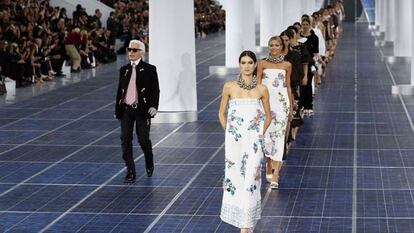 La escena muestra a Karl Lagerfeld veraneando en Saint Tropez. Toma una hoja y sus pinturas de colores y empieza a bosquejar la colección primavera / verano 2013 de Chanel. Hace calor y el septuagenario diseñador sueña con aire y brisa. Corte al Grand Palais, en París, ayer por la mañana. 13 falsas turbinas flanquean una pasarela que simula el efecto de un panel solar. Si Lagerfeld quiere viento, Chanel le construye un parque eólico. Así es como funcionan las cosas en la firma de lujo más poderosa del mundo.