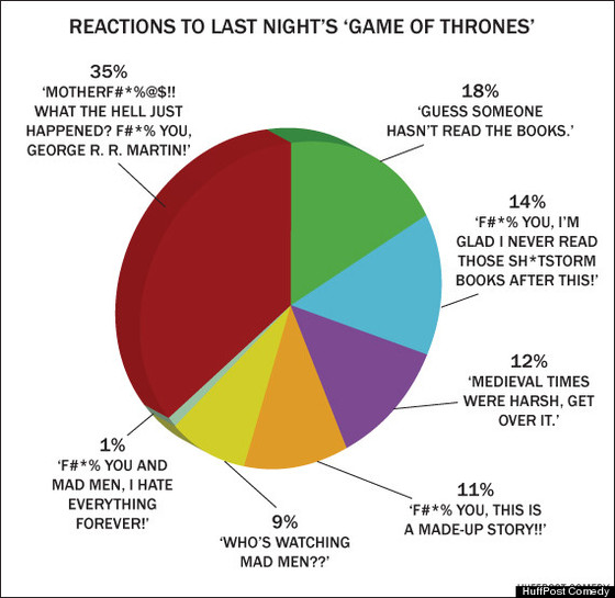 Mi reacción fue la del 35%, pero sin lo de fuck you RR Martin. Todo lo contrario, le admiro profundamente por ser capaz de hacer algo así. Me quedé estupefacta, pero la serie es genial, y son momentos como esos los que la hacen tan especial. Ya había olvidado la sensación de los primeros capítulos, en que no sabías quién iba a morir... De todos modos, con esto me reafirmo en no leer los libros hasta dentro de unos años, cuando acabe la serie. Sorpresas como estas no tienen precio.