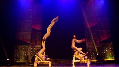 Para adentrarse en este vuelo imaginario propuesto por Eoloh algunas personas fueron invitadas a cargar unas valijas en una pequeña demostración la semana pasada. Cuándo cada uno coge la suya se muestra, bajo el pequeño montón de maletas, surge una caja de vidrio de poco más que medio metro cuadrado donde sonríe una chica con el cuerpo doblado en tres. El grupo no ha terminado de asimilar el espanto por la elasticidad sobrehumana de la artista cuando percibe que no hay una, sino dos chicas entrelazadas en el interior de la cajita. Se trata de dos contorsionistas etíopes de 19 años que han dedicado una buena parte de sus vidas a entrenar para los escasos minutos que les corresponde dentro del espectáculo que se reestrenó anoche en Madrid. Esta vez, en el Nuevo Teatro Alcalá, la función circense estará en cartelera hasta el 14 de julio. “Como estas chicas, no hay igual en el mundo”, elogia el director de Eoloh, Manuel Coronado.