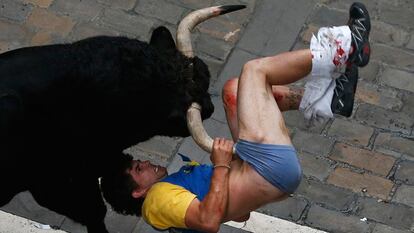 Se rompió la buena racha y la fama de la ganadería de El Pilar. Hubo sangre en las calles de Pamplona, el encierro fue el más largo de lo que llevamos de Feria -cuatro minutos y cincuenta y siete segundos- y la ‘bondad’ de estos toros salmantinos -solo dos corneados en sus cuatro comparecencias anteriores- se tornó en dramatismo a causa de uno de los miembros de la manada, que se ensañó con un corredor en la calle Estafeta y le hizo pasar uno de los peores momentos de su vida.