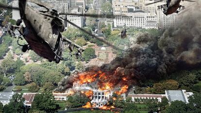 “Es la historia de un padre que intenta reconciliarse con su hija y se mete en un gran lío en la Casa Blanca”, resume Emmerich (Stuttgart, 1955) la trama de su última fatiga. Alrededor de este idilio familiar, sin embargo, el mundo se desmorona. Un grupo paramilitar se hace con el centro del poder de EE UU, encierra unos cuantos rehenes, destrona al presidente (Jamie Foxx) y empieza a soltar misiles como fuegos artificiales en Nochevieja.