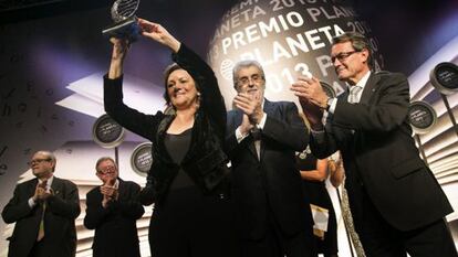 En una atmósfera pespunteada por el azul corporativo, la gala de entrega anoche volvio a mostrar el poder de convocatoria del premio. Bajo tres gigantescas pantallas y un moderno escenario, unas 1.300 personas se reunieron en el Palacio de Congresos de Barcelona. Si la representación mayoritaria era de medios de comunicación —casi una cuarta parte de los asistentes—, la política, menor, claro, tenía su carga de morbo. A la izquierda del presidente del grupo Planeta, José Manuel Lara, se sentó el presidente de la Generalitat, Artur Mas, quien, sin duda, mientras oía el desgranar de las votaciones a través de la voz de la presentadora Lourdes Maldonado, debía acusar aún las palabras del editor realizadas el lunes, cuando aseguró que la independencia de Cataluña “es imposible, y todos lo sabemos”.