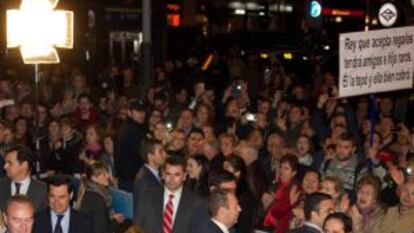 La presentación de Vicente Ferrer contó con la presencia de la Reina, los presidentes regionales María Dolores de Cospedal, Alberto Fabra y José Ramón Bauzá y la alcaldesa de Madrid, Ana Botella, que fueron recibidos con pitos y abucheos mezclados con vítores y aplausos. Un asistente portaba una pancarta que decía: "Rey que acepta regalos tendrá amigos e hija raros. Él la tapó y ella bien cobró".