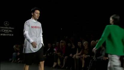 Una vez más su colección tuvo un referente autobiográfico. No one, cuenta, es fruto de “un tráfico de influencias” entre Pelayo Díaz, su compañero sentimental y ahora también profesional, y él mismo. “Las cosas que compartimos, que nos unen, que deseamos dejan huella en esta nueva propuesta común”, argumenta Delfín para dejar claro que Díaz no solo colabora en el diseño de bolsos, como en otras ocasiones, sino que su implicación en el proyecto es total. Una simbiosis que rubrica saliendo a saludar de su mano.