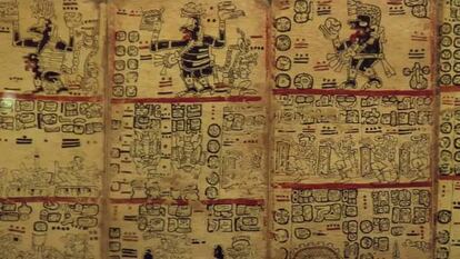 La galería despide al visitante con una de sus piezas protagonistas: el códice maya Tro-Cortesiano del periodo posclásico tardío —entre el año 1.300 y 1.600—, que mide casi siete metros de largo. “Junto al códice de Dresde, en Alemania y el de París, este es uno de los más extensos que se conservan. Es de carácter adivinatorio, está formado por 56 páginas por ambas caras y dividido en 11 secciones. La primera está dedicada a la relación de las divinidades con las fiestas; la segunda, a las catástrofes naturales, la tercera, a las fiestas de la sociedad y las ocho restantes tienen que ver con actividades económicas”, desarrolla el arqueólogo. El códice simboliza el conocimiento en América. En uno de los folios del códice se reconoce la cabeza de un jaguar. “Es el dibujo del glifo maya Balam”, alcanza a descifrar Jiménez, “y significa jaguar, señor del inframundo o chamán”.