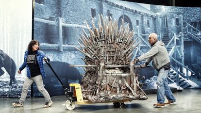 Así hasta que el viernes pasado aterrizaron en el aeropuerto de Barajas las 75 enormes cajas de madera, todas con el sello de la serie y numeradas. Tres tráilers de 13 metros y un cuarto camión adicional se encargaron de trasladar las cajas a Matadero. “Empezamos a descargar a las 5.30 de la mañana y en unas tres horas ya estaba todo dentro de la nave. Después, dos personas de HBO, los tour managers, organizan el montaje”, explica Raúl de Lamo, encargado de la producción de la exposición, mientras sigue atendiendo incansable las dudas y solicitudes del personal que trabaja preparando la muestra. Lo último que se montará hoy será toda la parte técnica y la experiencia virtual en 4D. Y tras el domingo, llegará el desmontaje, que tendrá lugar a toda velocidad para que las 75 cajas viajen hasta Berlín, esta vez por carretera.