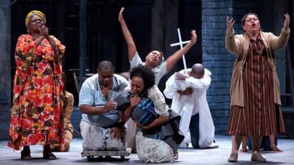 Porgy and Bess es una ópera folclórica negra compuesta por un blanco y, como todo producto folclórico, el protagonista último es el pueblo, aquí la comunidad de Catfish Row, un humilde arrabal negro en Carolina del Sur. Sus características invitan a que sea interpretada por una compañía itinerante: negra, por supuesto, como también estipulan los contratos (los únicos blancos en el Teatro Real son monjas, policías y, de nuevo, abogados). Y es así como ha recalado en Madrid la Cape Town Opera, un colectivo que la ha paseado por medio mundo pero que, asombrosamente, sigue siendo capaz de darle vida con la frescura y la entrega de la primera vez. La puesta en escena es sencilla, a veces algo primaria (Bess deja súbitamente la minifalda, las botas de tacón y el pelo suelto por el mandil, las zapatillas y un recogido), pero eficacísima, con actuaciones muy creíbles y momentos especialmente bien resueltos, como el asesinato de Crown y toda la escena final. Aunque se trata de un empeño colectivo en el que los egos se disuelven –todo parece cosa de Fuenteovejuna–, es justo destacar la formidable actuación de Xolela Sixaba como Porgy, perfecto en su papel de tullido obligado a desplazarse de rodillas o sobre una pequeña tabla con ruedas. De voz recia y rocosa, no es el más sutil de los cantantes y a veces sustituye extrañamente el Gullah original por inglés ortodoxo (“nothing” en vez de “nuttin”), pero en su Porgy confluyen verazmente el moderno Cristo, el embaucador, el jugador, el asesino y el amante capaz de peregrinar hasta Nueva York, la moderna Jerusalén, para recuperar a su Bess. A esta última le dio vida Nonhlanhla Yende, mucho mejor en su papel de chica mala que de mujer virtuosa, con bajos poco intimidantes pero buena línea vocal. Y mención especial para la Maria de Miranda Tini: fresca, descarada, indomeñable y con un torrente de voz libre y carnosa.