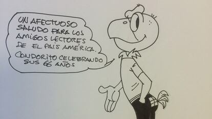 Esta mañana ha habido fiesta en el piso 18 de una moderna torre de Nueva Las Condes, un sector financiero y de oficinas del oriente de Santiago de Chile. Condorito, la caricatura chilena más famosa de Latinoamérica y el mundo, este 6 de agosto cumple 66 años, y el equipo de 15 personas que dan vida a la historieta lo han festejado con torta, muchos invitados y la figura estrella: un muñeco del famoso cóndor, que ha bailado y soplado las velitas. Hasta la policía uniformada, Carabineros, ha llegado hasta la editorial Televisa para saludarlo en su aniversario. Porque pese a que su creador falleció en enero de 2000, Condorito sigue distribuyéndose en 13 países de la región con éxito de ventas. En Chile es un símbolo y todas las generaciones lo sienten como propio.