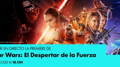 Canal+ retransmitirá en directo el 16 de diciembre, desde las 18:15h, el estreno mundial en Londres del episodio siete, presentado por Cristina Teva n la alfombra roja. En el madrileño cine de Callao, además, estarán Eddy Vidal y David Broncano, que contarán en directo lo que sucede en la Premiere local organizada por Disney ese mismo día. La copia de la película se trasladará escoltada por 100 Stormtroopers desde Flagship de Telefónica al cine. Movistar+ tiene hasta un cala exclusivo dedicado a la saga (esta es la programación, que incluye documentales y especiales).