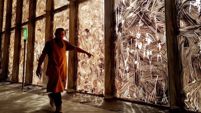 Estamos en las tripas de la Biblioteca Nacional de Francia, en París, discutible mastodonte de acero, cristal, hormigón y madera incrustado junto al Sena en 1996 por el arquitecto Dominique Perrault. Dentro de tres semanas se cortará aquí la cinta inaugural de un verdadero hito artístico: la creación, por parte de Miquel Barceló, de un fresco de arcilla de casi 200 metros de largo por casi seis de alto sobre las cristaleras que recorren uno de los lados de la Biblioteca y separan sus salas de exposición de su jardín interior.