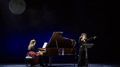 “Lo fabuloso en estas obras es que la música te allana el terreno. Te da el carácter y el impulso emocional. Me maravilla la capacidad de Liszt como dramaturgo”, afirma. Sanchís hace de narradora y de personaje en los cuatro melodramas del compositor húngaro: Leonore, El monje afligido, El amor del poeta muerto y El cantor ciego. Sobre el escenario se transforma en roble, en muerto, en amante fiel. Su pelo rizado y rojizo le otorga cierto aspecto brujil y con sus ojos claros mira muy a menudo a su pareja de baile, que está al frente del piano. Gómez-Morán es otro fichaje de lujo. La pianista es toda una experta en Liszt y está preparando su tesis doctoral sobre cómo tocaba el compositor. “Él decía que la técnica emana del espíritu. Es inconcebible saber qué movimiento hacer en un momento dado si no sabemos qué está pasando a nivel emocional en la obra. Además, tenía una gran percepción de lo teatral y eso se nota en sus melodramas”, explica. Pero este tándem no habría sido tan perfecto sin el ensamblaje de María Ruiz, que ha asumido el rol de directora artística.