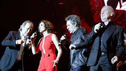De rojo pasión, con un escote por la cintura solo apto para las muy divinas, Ana Belén apareció como una llamarada en medio de tres señores de terno negro y cabelleras blancas en distinto grado de retirada y se hizo dueña del cotarro. Atacaron los cuatro Hoy puede ser un gran día, y ya todo dio lo mismo. Cantaran lo que cantaran, dijeran lo que dijeran, quedó meridiano que iba a ser una gran noche. La del reencuentro de Ana Belén, Víctor Manuel, Joan Manuel Serrat y Miguel Ríos con su público en el vigésimo aniversario de la gira El gusto es nuestro, en un concierto patrocinado por EL PAÍS y la Cadena SER. Un fiestón de veteranos arriba y abajo del escenario. Silbidos, bravos, ¡guapos!, atronaba la grada tras cada himno. Si no volaron sostenes ni gafas progresivas del público a los artistas no fue por falta de ganas.