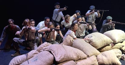 El espacio vacío ocupa buena parte del patio de butacas, con una única grada, que reduce el aforo a 150 espectadores. Mónica Borromello firma la escenografía (una caja negra, con sacos terreros a los lados) y el impecable vestuario. En el lateral izquierdo, dos músicos: al piano, Javier Coble, que despliega una partitura sutil y evocadora, respaldado, a la batería y percusión, por Paco Casas. A menudo, lo ideal de una escenografía, una iluminación (Ion Anibal) y una banda sonora es que nada se note y todo sume, como vectores de una atmósfera, y así sucede. Ernesto Caballero se encarga de tensar las cuerdas de los múltiples relatos, de crear ambientes y perfiles, con un ritmo que nunca decae. En un instante se pasa de una historia a otra con cuatro elementos de utilería, con esa luz cambiante y, desde luego, con ese fantástico reparto: Chema Adeva, Ione Irazabal, Javier Carramiñana, Macarena Sanz, Paco Déniz, Marisol Rolandi, Alfonso Torregrosa, María José del Valle, Pepa Zaragoza, Bruno Ciordia, Paco Celdrán, Borja Luna, Paco Ochoa, Paloma de Pablo y Mikele Urroz. Qué bien conjuntados y qué bien cuando pasan a primer término y se individualizan, de la épica a la intimidad, y luego se transforman en otros, en un suspiro, sin tropiezos, con la verdad natural por bandera.