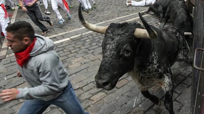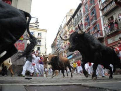 A las ocho en punto, el primero en salir a la cuesta de Santo Domingo fue un cabestro, y cuatro toros negros cerraban el grupo. En pocos segundos, dos cabestros más tomaron la delantera cuando faltaban escasos metros para alcanzar a los primeros corredores, a la altura de la imagen de San Fermín, a la que se le reza todas las mañanas.
