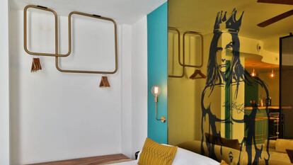 Al abrir la puerta de la habitación, una gramola se pone a dar vueltas y empieza a sonar Like a Rolling Stone. Es la habitación Bob Dylan. Sucede lo mismo con otras estancias: en la de Blondie suena Heart of Glass, en la de Bruce Springsteen lo hace Dancing in the Dark y en la suite de los Rolling Stones atruena Satisfaction. Hay más habitaciones dedicadas a iconos del rock and roll. Elvis Presley, David Bowie, The Beach Boys, The Doors, Queen o Iggy Pop, entre otros, también tienen la suya en Santos Dorado Suites, un hotel que abrió el pasado mayo en Ibiza con el fin de recuperar el espíritu rock que, mucho tiempo atrás, tuvo la isla.