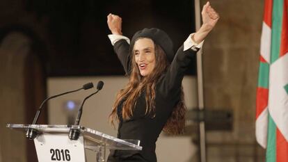 Así comenzó el discurso de agradecimiento Ángela Molina, ante un centenar de invitados, productores, distribuidores, y, sobre todo, amigos y admiradores. Guapísima, de negro, Molina, una de las actrices más relevantes de la historia del cine desde que la descubrió Luis Buñuel con Ese oscuro deseo del deseo, con más de un centenar de filmes a sus espaldas, fue recibida y despedida con cálidos aplausos. No dudó, siquiera, en ponerse una txapela que alguien le arrojó al escenario.