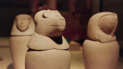 Sobre las creencias egipcias en el mundo de los muertos nos hablan los vasos canopos, que guardaban las vísceras momificadas del difunto. Cada uno representa a un dios encargado de proteger un órgano, los cuatro que se conservan de Heracleópolis Magna siempre estuvieron vacíos porque son de una época (800-700 antes de Cristo) en la que los órganos no se metían ahí pero se seguían colocando junto al muerto porque la protección la seguían ejerciendo. En los almacenes del MAN se conserva, además de cantidad de documentación y dibujos de las distintas campañas de excavación, multitud de ushebtis, pequeñas figuritas de fayenza (un tipo de loza) que según sus creencias trabajarían por ellos en la otra vida.