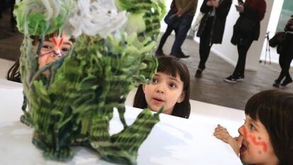 El chiste más facilón que se oye ante una obra de arte contemporáneo es el despectivo “esto lo podría hacer un niño”. Simplismo que no comparten Tomás y Mae, de 4 años, que observan con pasmo incluso las piezas más sencillas de Arco. En la galería argentina Slyzmud, en la zona del país invitado, cuelgan las obras de Sol Pipkin: nueces enlazadas con hilo, un palo decorado con cuentas, un óvalo de pasta de papel pintado. “Operaciones muy simples, pequeñas e insistentes, realizadas con materiales rescatados de la naturaleza, que no tienen un significado cerrado y visualmente reproducen procedimientos que la artista rescata de su memoria creciendo en la Patagonia”, recita la galerista Daniela Brunand. Los niños, en cambio, solo ven “una serpiente”, “una varita mágica” y “un bicho”, pero tienen clarísimo que “molan un montón” y que las ha hecho un adulto. “¿Qué tendra que ver que sea fácil o difícil de hacer para que te guste?”, se pregunta Thomas, de 6 años, hijo de un marchante.