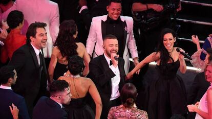- Timberlake pone a todos a bailar. La gala comenzó como hacía tiempo que no lo hacía, con un número musical que no era del presentador. Fue con la canción Can't stop that feeling de la película de animación Trolls y que aspiraba esta noche a un premio (la mejor canción se la llevó City of Stars, de La La Land) Y fue su autor e intérprete, Justin Timberlake, el encargado de lograr que todo el mundo se pusiera de pie por primera vez en la noche. Timberlake comenzó la actuación fuera del teatro y entró junto a sus bailarines cantando entre las estrellas de Hollywood. Vimos bailar y pasándoselo bien a Halle Berry, Jackie Chan, Javier Bardem, Nicole Kidman, Jessica Biel, o Denzel Washington entre otros.