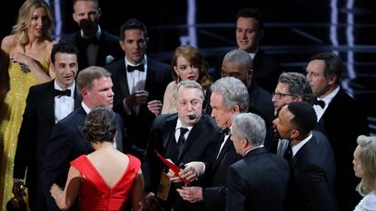 Los espectadores que llenaban el teatro Dolby el domingo por la noche acababan de ser testigos en directo del mayor error de producción en 89 años de historia de los Oscar. Como todo el mundo sabe a estas horas, alguien le dio un sobre equivocado a Warren Beatty, que sin saber qué hacer con él se lo enseñó a Faye Dunaway, que leyó un título equivocado nada menos que en el premio a la mejor película.