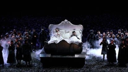 Laurent Pelly carga las tintas en la ética, no en la estética, y de aquel ballet parisiense (los protagonistas cantaban sentados a ambos lados del escenario) hemos pasado a esta negra, negrísima fábula que arremete casi por igual contra soberanos y contra súbditos, más que criticados, ridiculizados por Rimski y su astuto libretista, Vladímir Belski, que remozó el original de Pushkin a su antojo para servir a las invectivas del compositor. El zar Dodón es un personaje risible, entregado sin rebozo en pijama y zapatillas a la acidia, uno de los muchos pecados capitales en que lo veremos incurrir durante la ópera. Su enorme cama se encuentra, eso sí, sobre lo que parece ser una simbólica montaña de detritos negruzcos: esos son los cimientos de su régimen autocrático. Las desastrosas campañas militares de la Rusia zarista (la cama reposa sobre un tanque en el tercer acto) son también puestas en solfa por Rimski, y Pelly reafirma su talento para hacer befa del militarismo, ampliamente demostrado en este mismo teatro con su excepcional montaje de La fille du régiment.