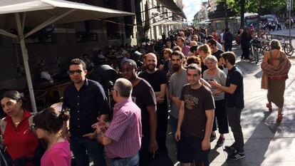 Era una cola más propia de un concierto pop que de la charla de un filósofo lacaniano que reivindica la vigencia del marxismo. Pero está claro que Slavoj Žižek (Liubliana, Eslovenia, 1949) y su filosofía de largo aliento, a la par que provocadora, trufada de referencias tanto a Lady Gaga como a Gilles Deleuze, ha conseguido traspasar las fronteras de la Academia para llegar a gente joven que no suele leer tratados de filosofía. Cientos de personas han acudido este miércoles al madrileño Círculo de Bellas Artes para escuchar a un pensador que se ha convertido en todo un fenómeno. Había pantalones de chándal cortos, pantorrillas tatuadas y crestas entre los primeros en ponerse a hacer cola. Varios asistentes contaron que fueron a la conferencia gracias a los vídeos virales de intervenciones del filósofo que circulan por la red. Muchas no pudieron acceder a la sala de columnas, que acogió a unos trescientos asistentes.