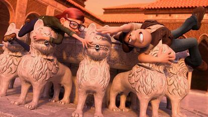 “Lo esencial es mantener a los personajes, pero exprimirlos. Es un poco lo que ocurre en las series televisivas: en las primeras temporadas, los protagonistas están a medio hacer, y hay que empujarlos”, afirma Gato. Así que ahí están todas las caras conocidas para el público de la aventura original: Tadeo, su perro Jeff, la arqueóloga Sara Lavrof o el loro Belzoni. Tanto cariño les tienen a sus criaturas que esta vez los cineastas han decidido llevárselas directamente a casa. En la primera entrega, Tadeo y compañía visitaban Perú. Ahora, en cambio, viajan a España. En concreto, a Granada. “Uno de los productores nos sugirió que sería un escenario espectacular”, cuenta Alonso. Además, la civilización frigia —la del Rey Midas— habitó el sur de España de ahí que la ciudad nazarí también sirviera a la trama. Y, luego, claro, estaba la posibilidad de recrear el patio de los Leones de la Alhambra o una enloquecida persecución por las calles del Albaicín. Como en los filmes de Hollywood, pero a la española. Marca de la casa, en el fondo: el propio Tadeo es un Indiana Jones pasado por el filtro de Superlópez y Mortadelo y Filemón.