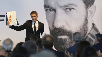 En un acto marcado por la tormenta política que sufre España y el descenso del IVA al cine anunciado el día anterior por el ministro de Educación, Cultura y Deporte, Íñigo Méndez de Vigo, Antonio Banderas ha recibido hoy, sábado, el Premio Nacional de Cinematografía como es habitual, en el Festival de San Sebastián, pero por primera vez en el centro Tabakalera. Tan primera vez, que el galardonado se ha llevado de regalo un rastro vertical de pintura blanca en la espalda de la chaqueta de su impoluto traje negro.
