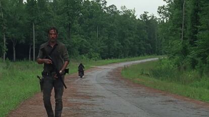 Carl, con las greñas más largas que nunca, busca gasolina y se encuentra con un hombre que parece perdido (física y mentalmente). Rick lo ahuyenta con un disparo y aquí es donde vemos que el protagonista de la serie y su hijo no están en el mejor momento de su relación. Carl vuelve a la gasolinera y deja un par de latas al hombre que vio con una nota de perdón. Este personaje le observa desde detrás de un arbusto. Y poco más. Suponemos que esto evolucionará de alguna manera…