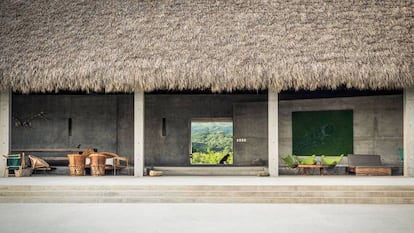 Desde la playa, apenas se aprecian una docena de palapas. En su interior, 300 metros de muro recorren el lugar. Es la columna vertebral de la casa. A un lado está el sur, el mar y la paradisiaca costa; al otro, el norte, la montaña y el extenso jardín. Solo en ciertos puntos estratégicos del complejo se puede atravesar el hormigón. “En Casa Wabi hay que decidir de qué lado del muro se está”, comenta Ríos.