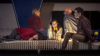 Cinco dramaturgos (Juan Cavestany, Yolanda García Serrano, Anna R. Costa, Juan Carlos Rubio y Alfredo Sanzol), cinco actores (Antonio Gil, Ángeles Martín, Samuel Viyuela González, Carolina Yuste y Pepa Zaragoza) y veinte personajes están detrás de esta conmovedora función que se estrena el próximo 11 de enero en el Teatro Bellas Artes de Madrid y que ha contado con la experiencia y los relatos de las periodistas Macarena Berlín y Mara Torres. La soledad y el silencio de la noche, la oscuridad solo atenuada por una suave luz, que se vive cada madrugada en el estudio de la SER se abre paso en el escenario del teatro, en el que el teléfono es también el punto de conexión con el mundo exterior, aquel palpita en la vida real. Algo que conoce de cerca Sánchez-Cabezudo (Madrid, 1979), alma de Historias de Usera, el montaje con el que homenajeó a los vecinos de este barrio madrileño y por el que recibió el Premio Max a la mejor producción privada en 2017. “El protagonista de Historias de madrugada es aquí también el vecino anónimo, la gente de la calle. Es todo un homenaje a la gente corriente que en soledad quiere compartir un pedazo de su vida”, asegura el director, oyente durante muchos años del programa de la Cadena SER.