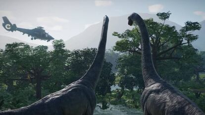 Si uno se fija en los tráilers promocionales de Jurasic world evolution, verá que no persiguen una descripción minuciosa de cómo se juega a este crea-tu-parque-jurásico. Lo que busca es recrear esa emoción que sentimos todo el planeta con aquella película imposible que dio carne, sangre y alma a los dinosaurios. Y muy particularmente con aquella primera escena del brachiosaurio y su cierre con la pacífica manada de titánicos herbívoros. Vemos dinosaurios en silueta a contraluz, dinosaurios bajo la lluvia, bajo el sol. Filmados con morosa lentitud. Como en un documental de la National Geographic. Pero con la banda sonora más poética que épica que le da un realce mítico a las imágenes, que subraya lo imposible de lo que vemos.