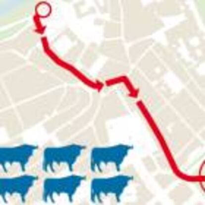 De los 848 metros con los que cuenta el trazado, algunos de ellos tienen pendientes de hasta el 6% de desnivel, curvas de 90º donde suelen resbalar las reses y hasta un tramo que finaliza en forma de embudo, justo al llegar a la plaza. Consulta el recorrido completo aquí