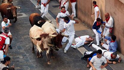 La ‘mala fama’ de los toros de Cebada Gago -56 corneados en 29 comparecencias en San Fermín- se notó en el menor número de corredores en los primeros tramos del encierro, en la rapidez de la carrera -solo 2 minutos y 33 segundos- y en las numerosas caídas, atropellos, pequeños montones y sustos que se han producido. Pero la noticia de la mañana es que, en contra de la tradición, los temibles toros gaditanos no han dejado heridos por asta y solo se han contabilizado dos mozos con traumatismos craneales y otros dos contusionados -uno, en un brazo y otro, en la cara-, según el primer parte de los servicios sanitarios.