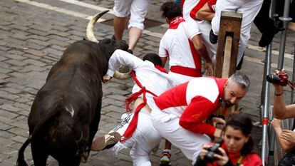 Ese mismo animal, envalentonado, quizá, por su acción, aceleró por la bajada de Mercaderes, de tal modo que no pudo esquivar los tablones que cierran la curva que da paso a la larga y rectilínea calle Estafeta. Momentos antes del golpe final se encontró con un mozo que corría a su lado por la zona izquierda del vallado y lo aplastó contra las tablas. Cayó el animal, huyó de la quema como pudo el joven, y el toro consiguió levantarse, no sin esfuerzo, y reanudar la marcha, aunque sus compañeros ya lo habían sobrepasado.