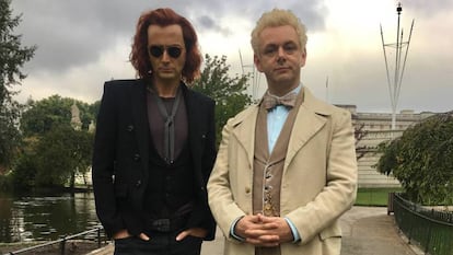 "Buenos presagios va muy bien", contó Gaiman a EL PAÍS el pasado diciembre en conversación telefónica por la presentación de su libro Mitos nórdicos (Ediciones Destino) justo cuando comenzó el rodaje. La adaptación de la novela que escribió y publicó en 1990 junto a Terry Pratchett (autor de la saga Mundodisco) es una comedia en seis episodios que cuenta la relación entre un demonio y un ángel (David Tennant y Michael Sheen) que tratan de evitar la llegada del Apocalipsis cuidando de un niño que es el supuesto nuevo anticristo. El reparto se completa con nombres como Mireille Enos, Mark Gatiss, Jon Hamm (el protagonista de Mad Men será el arcángel Gabriel), David Morrissey y Frances McDormand, que pondrá su voz a Dios.