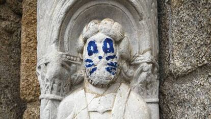 Apenas una semana después de la presentación al mundo de la remozada fachada del Pórtico de La Gloria -tras cinco años de cuidadosa intervención que le ha permitido recuperar su policromía original- aparece pintarrajeada una de las figuras de la fachada de las Platerías: una escultura del siglo XII situada en la parte inferior de una de las columnas de mármol.