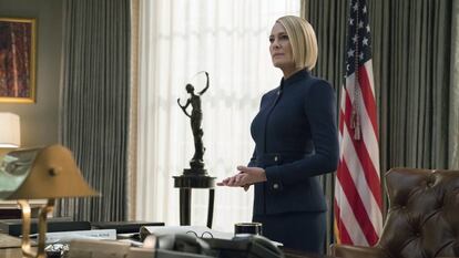 Hay hombres que nunca mueren. Es el caso de Francis Underwood, el personaje que llegó a presidente demócrata de Estados Unidos en la serie House of Cards y que ha terminado muriendo fuera de cámara cuando el actor que le encarnaba, Kevin Spacey, fue despedido tras las acusaciones en su contra por casos de abuso sexual. Pero la sombra de Underwood y de Spacey sigue presente en esta sexta y última temporada de la serie. “Lo sé. Todos lo notamos. Pero la transición no pudo ser más civilizada. Nos atamos las botas y echamos a andar porque teníamos mucho terreno que cubrir con ocho episodios por delante en lugar de 13”, comenta a EL PAÍS Robin Wright, quien interpreta a su esposa —y ahora viuda— Claire, la nueva presidenta. Movistar Series emite mañana sábado en maratón toda esta última temporada —a partir de las 15.30; también disponible bajo demanda—.