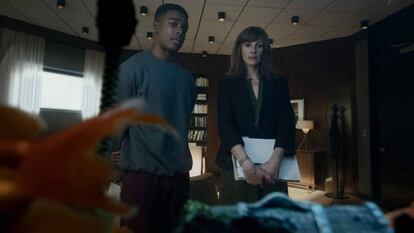 El añorado Alan J. Pakula, con la complicidad del recientemente desaparecido William Goldman, armó en 1976 un thriller político seminal dentro de la historia del séptimo arte. Alentados por el caso Watergate, destapado por los periodistas Bob Woodward y Carl Bernstein, y adaptando el propio libro escrito por los dos héroes del Washington Post, el binomio Pakula y Goldman urdía un intenso thriller sobre las cloacas del estado y las verdades oficiales y oficiosas. Una carga de aprieto alrededor de esa distancia que separa la ética periodística de esa sensación creciente de estar jugándose el pellejo en el intento de cumplir con la obligación profesional. Una inquietud que de algún modo queda traspasada en los recovecos del serial norteamericano. No solo en el anodino agente del Departamento de estado —interpretado por Shea Whigham—, y toda la investigación que lleva a cabo para esclarecer lo sucedido, sino por ese trasunto de cuestionar esa versión oficial que suplanta una verdad incómoda y peligrosa, así como por toda la huella estética a la hora de componer el entorno laboral del personaje de Carrasco.
