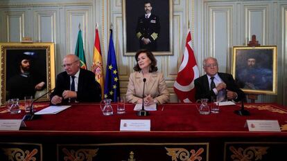 El acto, en una sala del Cuartel general de la Armada, en Madrid, ha contado con la presencia de la vicepresidenta del Gobierno, Carmen Calvo; el ministro de Negocios Extranjeros de Portugal, Augusto Santos Silva, y el historiador José Álvarez Junco, flanqueados por los retratos de ambos navegantes. "En esta celebración hay lugar para todo menos para glorias nacionalistas actuales", ha señalado Álvarez Junco, catedrático emérito de Historia del Pensamiento y de los Movimientos Políticos y Sociales en la Universidad Complutense de Madrid. El historiador ha recordado que en aquel entonces "no existía España, era la Corona de Castilla la que lo financió, y su rival era Portugal. En aquella época, la palabra España servía para designar a la península Ibérica".
