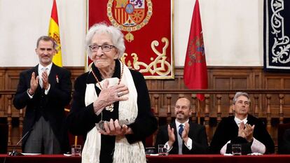 Un final improvisado lo dijo todo. Ida Vitale (Montevideo, 1923) había finalizado su discurso. Acalló los aplausos con un gesto. “Querría hacerme perdonar la audacia de venir aquí, a este lugar, y meterme a hablar de Cervantes”. Solo después descendió las escaleras del púlpito laico del paraninfo de la Universidad de Alcalá de Henares, donde esta mañana ha recibido el Premio Cervantes 2018 de manos del rey Felipe VI. Había dicho lo que no estaba escrito y quería decir, una de esas “cosas absurdas y desacomodadas” que le salen del alma, como los besos que envió con la mano al público al recoger el premio y al Rey tras escuchar su discurso.