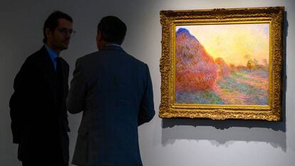 Pocas obras inspiran tanto al verlas como Meules, de Claude Monet. Y por eso no era una casualidad que Harry Dalmeny tuviera el radiante lienzo a sus espaldas mientras dirigía la gran noche de subasta en Sotheby´s. El valor estimado del cuadro estrella excedía los 55 millones de dólares (49 millones de euros). La cifra la superó con facilidad. La puja se cerró en 110,7 millones de dólares (98 millones de euros) —incluida la comisión— y marcó así un nuevo récord tanto para el artista como para una obra de arte impresionista.