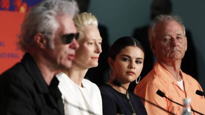 Tilda Swinton y Bill Murray estuvieron en el encuentro metidos en sus roles. Mientras que la primera se rio un poco del mundo de la moda y de las alfombras rojas —"Yo lo que busco es dar espectáculo"—e insistió en la necesidad de seguir impulsando el cine realizado por directoras, "empezando desde la educación", el segundo bromeó en sus respuestas. Trabaja mucho con Jarmusch porque, decía todo impasible, le envía "una tonelada de dinero y muchos regalos". Preguntado por su afinidad al cine de terror, Murray dijo: "Me encanta estar en Cannes". Y cuando el moderador respondió: "Pero no hay zombis en La Croisette", el actor apostilló: "¿Seguro?". Y sobre si cree en la vida después de la muerte, confesó: "Sí, pero no para todos". Solo se puso serio cuando contó: "Soy mejor persona cuando trabajo, y esa es mi aportación a la humanidad".