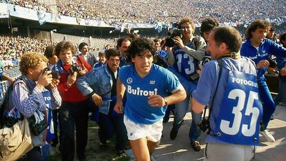Maradona arranca con un prólogo rápido que resume el paso del futbolista por Boca Juniors y el Fútbol Club Barcelona (esa parte, que ocupaba una hora, se ha comprimido en cinco minutos para que el filme se quede en dos horas de duración). El 5 de julio de 1984 Maradona ("Me interesa más la gloria que la plata"; dice) llega a Nápoles, uno de los peores clubs de Italia y el único que le ha querido. En su rueda de prensa de presentación, estalla uno de los temas de la película: le preguntan si la Camorra ha financiado el fichaje. Desaforado, el presidente del club, el controvertido Corrado Ferlaino, echa al periodista. Cuando Maradona salta al campo, en una gran pancarta se lee: "Gracias, Ferlaino. Gracias, Maradona", con el nombre del jugador más escondido. Ferlaino no es el malo de la película, pero ayudó a la debacle emocional de Maradona.