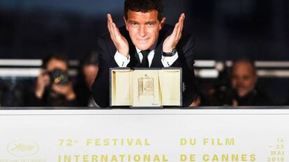 En uno de los salones del Palacio de Festivales, Antonio Banderas (Málaga, 58 años) se sienta con el premio en la mano. “Parece un bote de colonia”, y lo mira con cariño. Son las 22.15 y desde la mañana sabe que ha ganado el galardón a la mejor interpretación masculina en Cannes por Dolor y gloria. Moreno, de traje impecable, comenta: “Más que un momento histórico, es prehistórico”. Cuenta que hace unas noches cenando se cruzó con Tarantino. “Tan enloquecido como siempre me dijo: ‘Soy director de cine en parte por Pedro. Su película me encanta. Dile que genuinamente —y repitió el adverbio 14 veces— quiero que gane la Palma de Oro”.