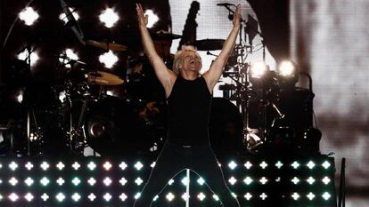 No fue todo el concierto un karaoke, que quede claro. El problema de Jovi es cuando acomete sus canciones de tonos altos, que son muchas. ¿Fue el de anoche un hecho puntual? No parece. Quizá lleve varios años quebrado. Él mismo lo confesó en una entrevista de 2016, que cada noche de concierto “soñaba con volver atrás en el tiempo y pedirle a su yo de 18 años que apareciera para cantar las notas más altas de Livin' on a prayer”. Y ya, de paso, que ese Bon Jovi exultantemente joven entone Keep the faith, Bad medicine o It's my life, que sonaron anoche más en las gargantas de los espectadores que en la del protagonista.