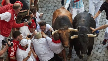 Y todo sucedió según lo previsto. Otra vez, una carrera rápida y limpia, tan previsible como anodina, demasiada perfecta para un espectáculo que pretende ser vivo y emocionante. Los mozos están quejosos y por las redes sociales convocaron una sentada de protesta que tuvo un corto alcance; algunos de ellos, pocos, ciertamente, siguieron la convocatoria en distintos tramos de la carrera y esperaron el sonido del cohete sentados en la calzada, muestra de que la decepción persiste ante la imposibilidad de correr delante de los toros, perfectamente arropados por los bien entrenados cabestros.