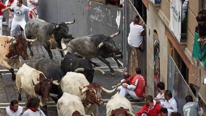 Uno de los cuatro toros cárdenos adelantó a los cabestros en la recta, atestada de mozos, a velocidad de vértigo, lo que permitió el lucimiento y el pavor, también, de algunos corredores que quedaron emparedados entre pitones de distinta procedencia.